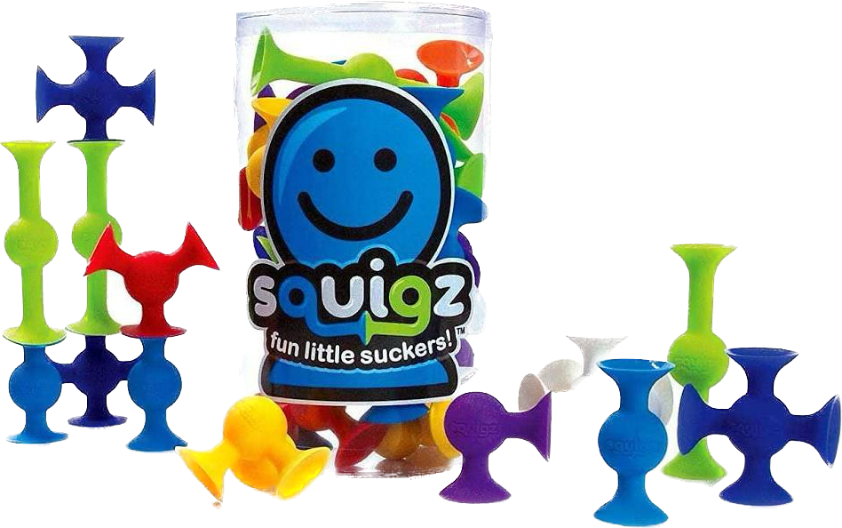Squigz are great toy for all ages. They are safe to chew and teeth on for our babies and work as a teether toy (see rattles and teethers). They are the right size for easy grasp and can roll away or topple when engaged in tummy time and encourage crawling. Our toddlers learn to push and pull squigz on various surface heights to work on full reaches, squats, and righting reactions in physical therapy. The suction provides resistance for hand strengthening. Squigz fit just right under and in between the toes of our older kids for picking them up with their feet for various reflex integration and strength activities. Our older kids use their imaginations on what they can build or how they want to use squigz.